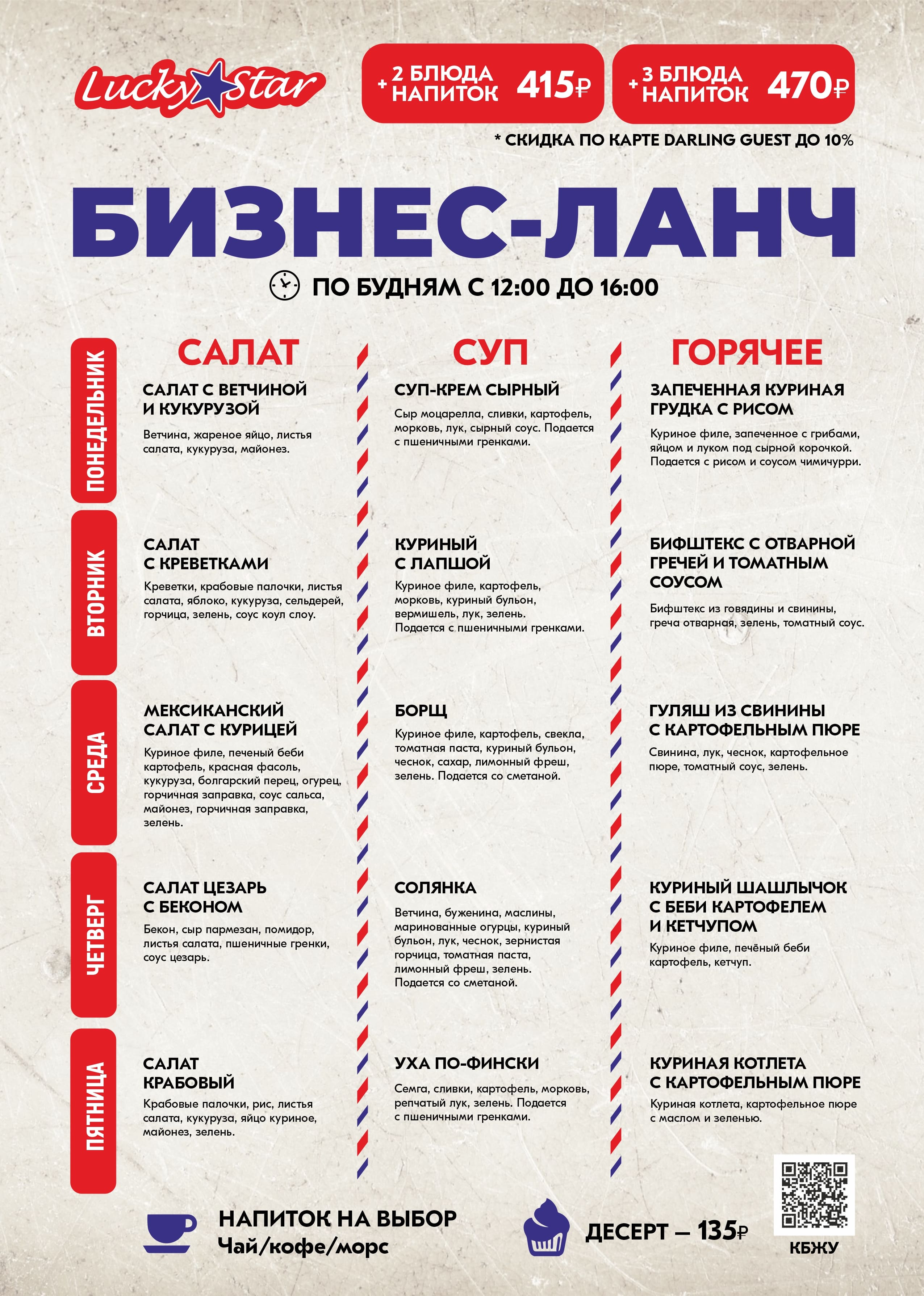 Лаки Стар - ресторан душевных встреч по любому поводу. К нам заходят на бизнес-ланч или встретиться с друзьями, отдохнуть всей семьей или потусоваться на баре. Если ты любишь большие бургеры, сочное мясо и горячие мексиканские вкусняшки, то тебе точно у нас понравится!