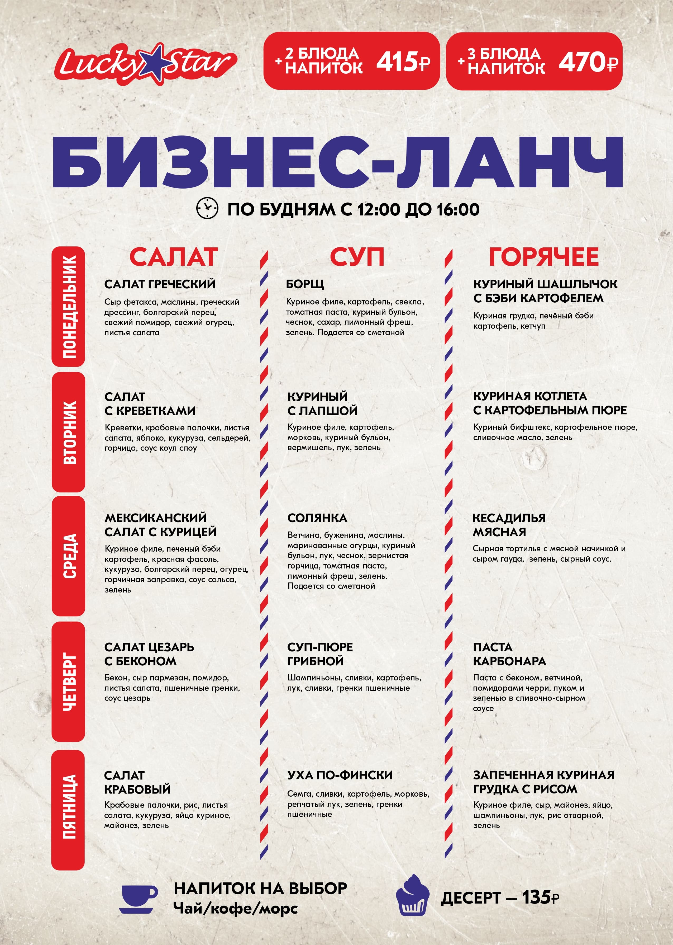 Лаки Стар - ресторан душевных встреч по любому поводу. К нам заходят на бизнес-ланч или встретиться с друзьями, отдохнуть всей семьей или потусоваться на баре. Если ты любишь большие бургеры, сочное мясо и горячие мексиканские вкусняшки, то тебе точно у нас понравится!